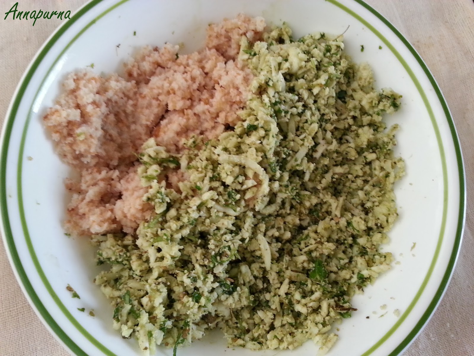2. Crush ginger, green chilies and coriander leaves together and keep aside. Grate or crumble the Paneer / Cottage Cheese in a bowl. Add the coriander chili crush to the grated paneer.