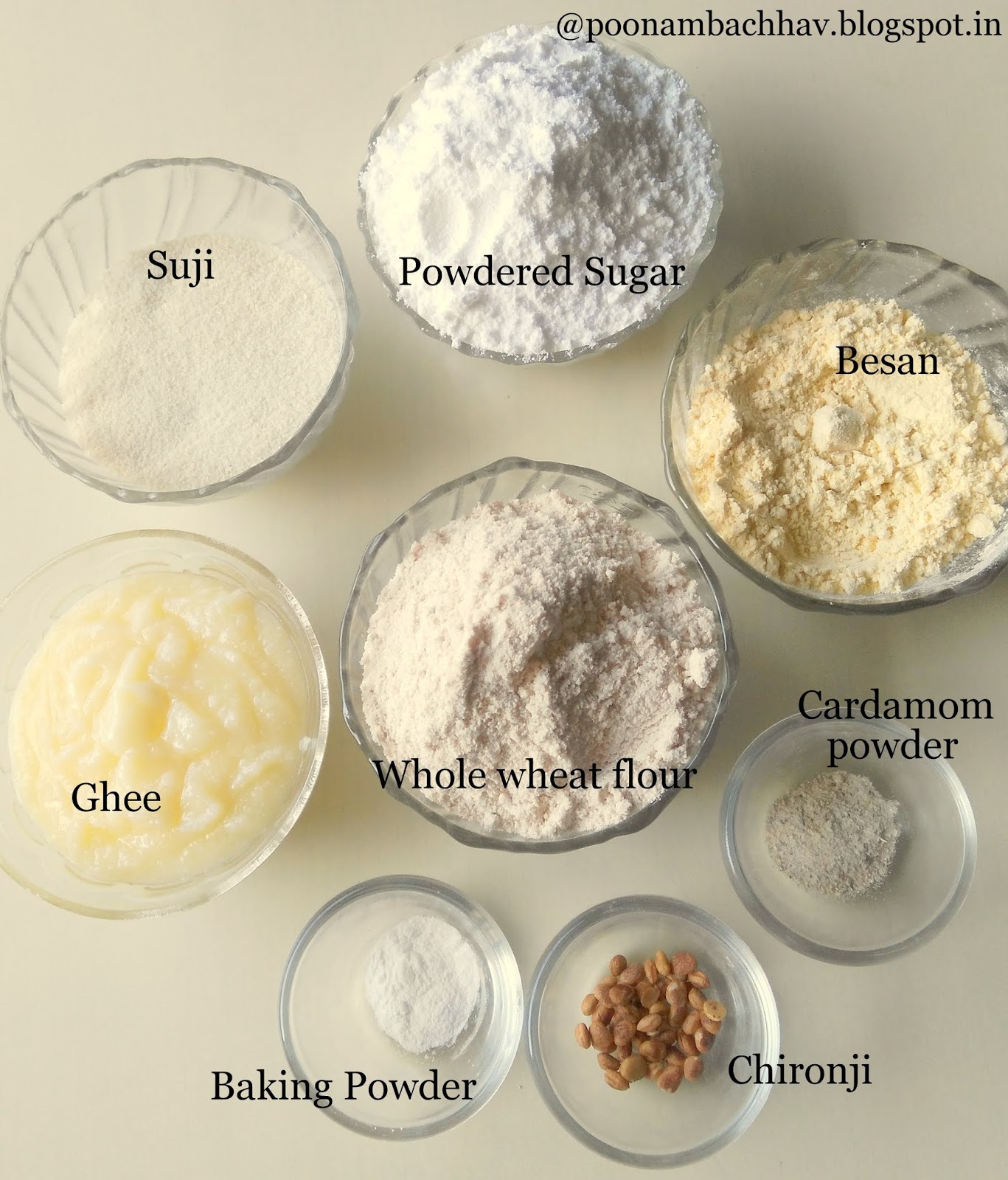 - Preheat the oven at 180 degrees Celsius for 15 minutes. Line the baking tray with aluminum foil or grease it with ghee and keep ready until use. Now, take the whole wheat flour, chickpea flour, powdered sugar semolina, baking powder, cardamom powder in a blender jar or food processor. Pulse it 2-3 times to mix the flours well with powdered sugar.