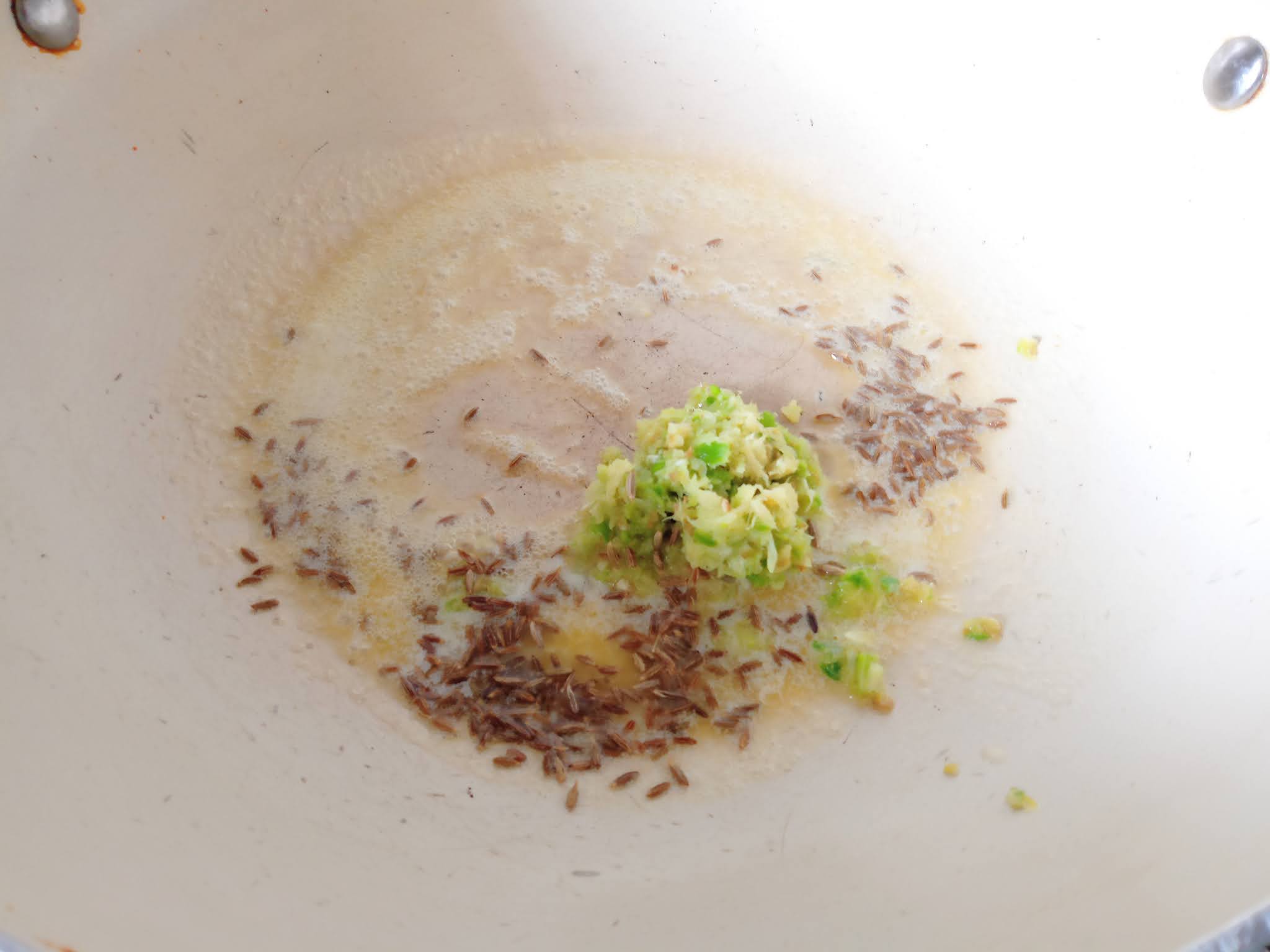 - To make the garlic-ginger-green chili paste, take 3 green chilies, 1/2 inch ginger and 4-5 garlic cloves and make a paste of it without adding water in a mortar and pestle or grinder jar.